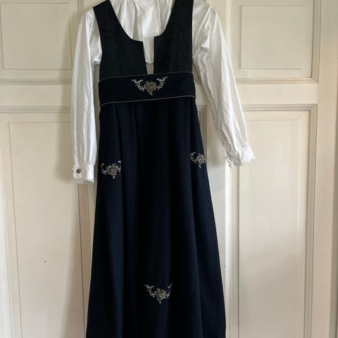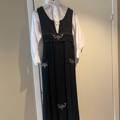 Lekker festdrakt fra Maxemilia i ullblanding. Følger med tørkle til hår eller hals og skjorte (Cubus). Det er en liten skade på venstre side i front, denne kan enkelt repareres eller bare brukes som den er. Stoffet har også nuppet seg litt, men den fremstår fortsatt fin og er klar for flere feiringer.