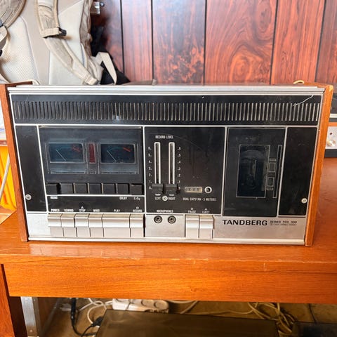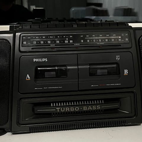 Kraftig vintage boombox med dobbel kassettspiller og stereo radio.
