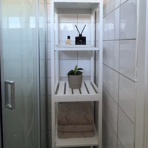 IKEA baderomshylle over toalett i hvitlakkert metall. Hyllen er utformet for å stå over et vegghengt toalett og utnytte plassen på badet. Den har flere åpne hyller som gir oppbevaringsplass til for eksempel toalettpapir, planter, lys eller andre baderomsartikler. Nøytral hvit farge som passer inn på de fleste bad med fliser eller malte vegger.
