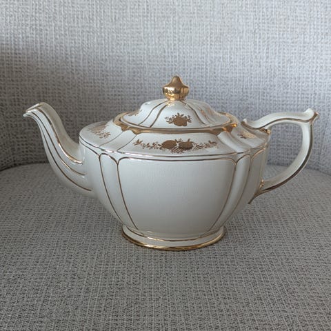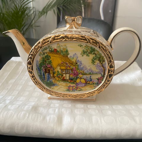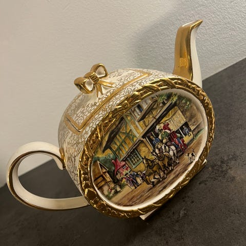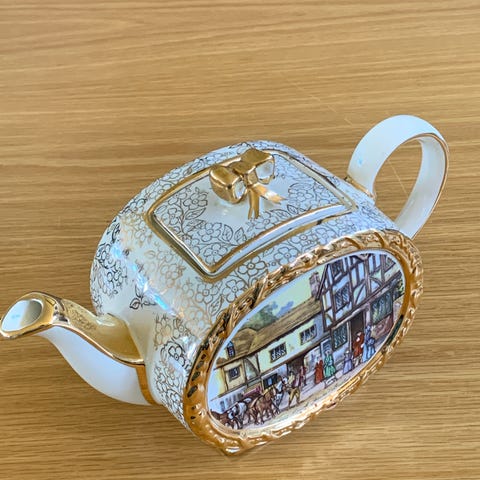 Porselenstekanne i rektangulær form med tut og hank i klassisk stil. Kannen er hvit med gullfarget mønster og detaljer, inkludert gullkant rundt lokk, hank og tut. På sidene er det ovale felter med fargerikt motiv av hest og vogn i landsbymiljø. Lokket har en sløyfeformet topp i gull. Egnet til servering av te eller som dekorasjonsgjenstand i hjemmet.