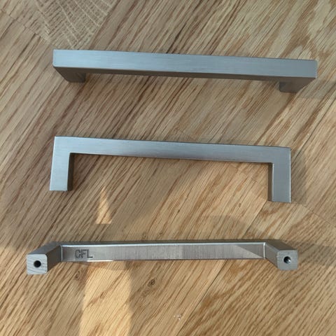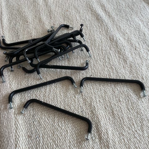 Håndtak av metall til kjøkkenfronter gis bort samlet. 19 cm mellom skruehull. Synlig brukt.
