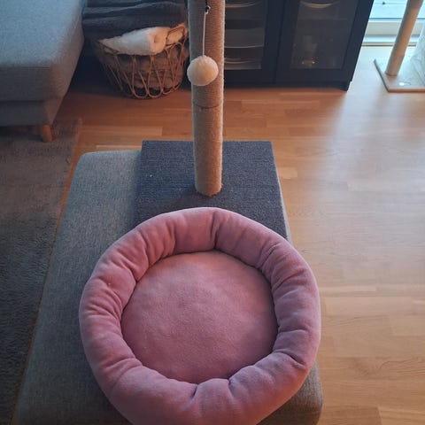 Pent brukt katteseng til vegg. Senga festes med borrelås men kan naturligvis brukas med andre senger eller andre behov.