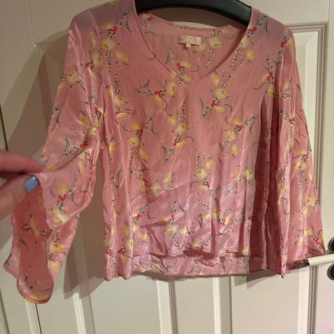 byTiMo genser for dame i størrelse XL. Genseren er flerfarget med blomsterprint i rosa og grønn på lys bunn. V-utringning og lange ermer. Kort modell (42 cm)