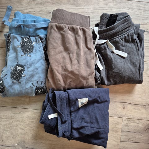 To ullbukser, èn stillongs og en sliten Adidas-bukse str 6-8 år