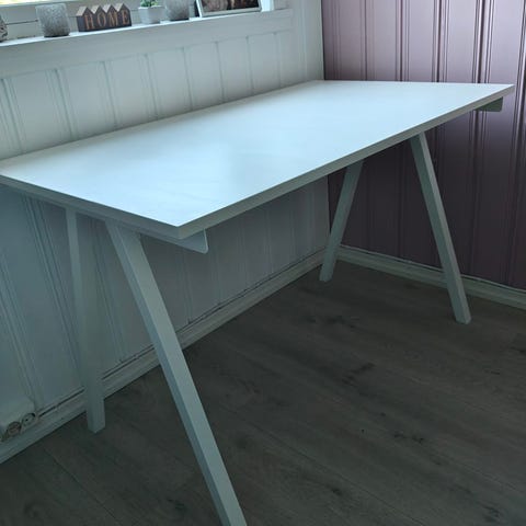 Hvit skrivebord med rektangulær bordplate og to uttrekkbare skuffer under platen. Bordet har kabelhull på høyre side av bordplaten for praktisk føring av ledninger. Understell i samme farge som bordplaten. Egnet som arbeidsbord eller lekseplass i hjemmekontor, stue eller soverom.