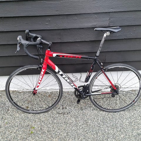 Pen Trek madone 6.5 karbon landeveissykkel for unisex med rammestørrelse 56 cm og 28"/700c hjul. Sykkelen har bukkestyre, felgbremser og girsystem med bakgir og kassett. Passer til landeveissykling og trening på asfalt. Rød ramme med lyse detaljer og hvitt sete og styretape. Egnet for ryttere som ønsker en landeveissykkel med standard hjulstørrelse og medium rammestørrelse.