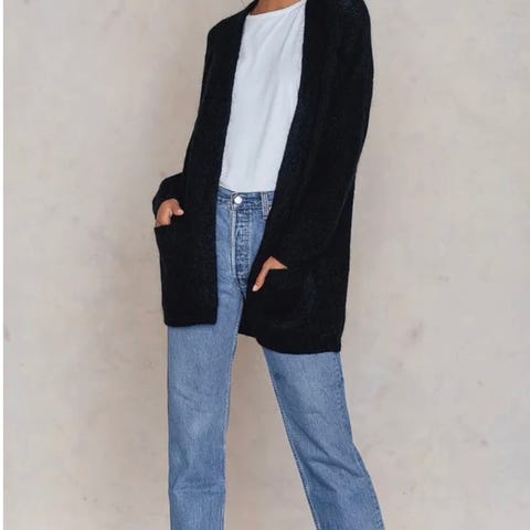 By Malene Birger cardigan i størrelse L. Cardigan er dypblå og laget i ullblanding med hovedandel ull. Myk og god. Modellen har åpen front uten synlig lukning og to frontlommer. Lengden er 100 cm.
