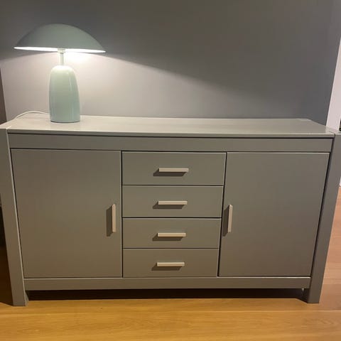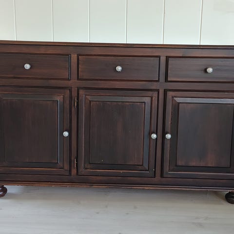 Sjarmerende og rustikk skjenk selges rimelig mot henting. Skjenken er malt av tidligere eier med maling som ikke tåler vann og har derfor noen synlige merker der det har blitt vått. Trenger litt kjærlighet og kanskje et strøk maling.
