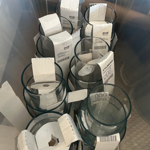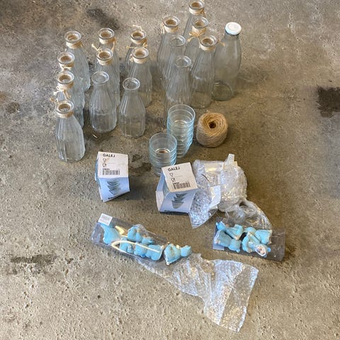 Diverse små vaser brukt til borddekorering. Må hentes.