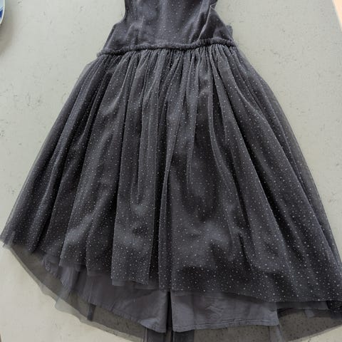 Nydelig kjole med flere lag og glitter fra Pompdelux i størrelse 110/116. Farge mørk lilla 💜 Bildene viser kjolen i forskjellig lys.