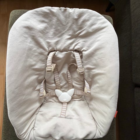 Stokke høy barnestol babysete med sele i lys beige tekstil og plast. Det har integrert sikkerhetssele og avtagbar bøyle til leke. Trekket er polstret for økt komfort og kan tas av for rengjøring. Egnet for bruk på Stokke tripptrapp stol.
