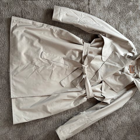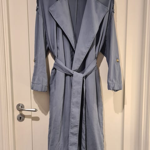 BRGN Yr Coat regnjakke for dame i størrelse XL. Jakken er lys blå og laget i 100 % polyester med fôr i 100 % nylon. Modellen har belte i livet, stor krage og knepping foran. Vanntetthet er oppgitt til 20 000 WP og pusteevne til 15 000 g/m²/24t (ifølge vaskelappen). Egnet som regntøy og ytterjakke i vått vær.