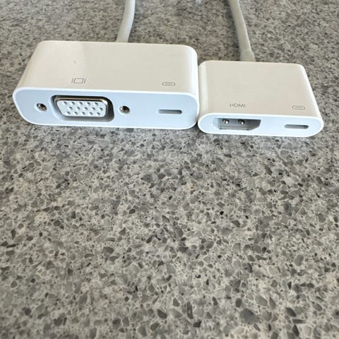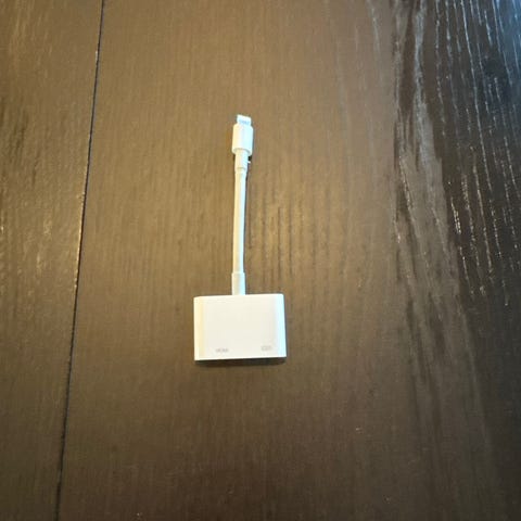 Apple Lightning Digital AV-adapter hvit. Adapteren har Lightning-kontakt i den ene enden og HDMI-utgang samt ekstra Lightning-port i den andre enden. Brukes for å koble enheter med Lightning-tilkobling til en skjerm, TV eller projektor med HDMI-inngang for overføring av digital lyd og bilde. Farge: hvit.