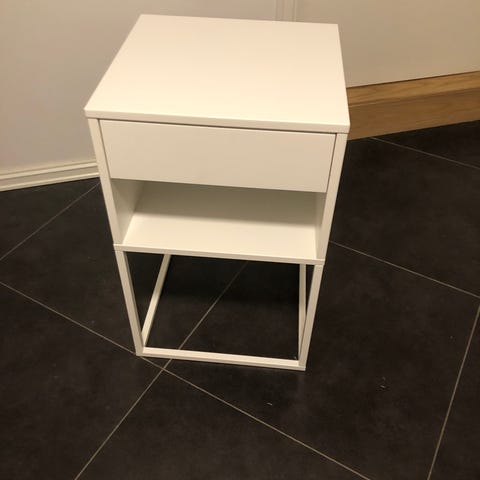 IKEA Vikhammer nattbord i hvit utførelse. Bordet har en åpen, kubisk stålramme nederst, en åpen hylle og en skuff øverst for oppbevaring av småting. Egnet som nattbord ved seng eller som lite sidebord ved sofa. Målene er omtrent 40 cm bredde, 38,5 cm dybde og 65 cm høyde, med en romslig skuff og praktisk oppbevaringshylle under.