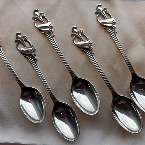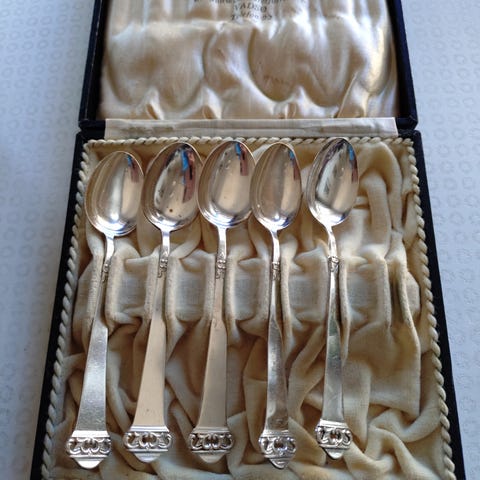 5 stk 10,5 cm lange årsskjeer i ekte sølv. Vekten er litt forskjellig, fra 11 til 13 gram pr skje.