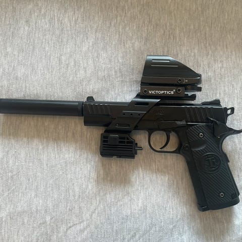 * Spyder E-MR1 paintball markør med montert red dot sight, justerbar kolbe (skulderstøtte) og standard 30 cm barrel (løp).