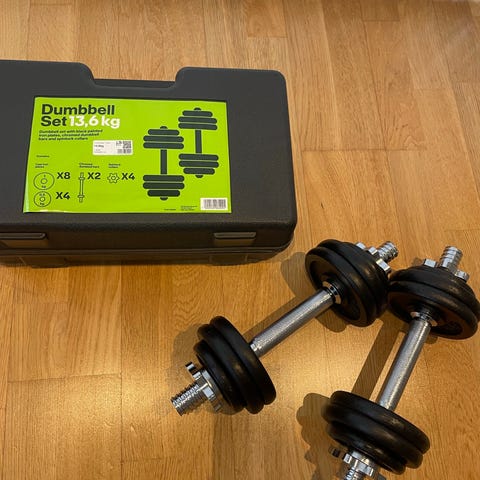 Sett bestående av to manualstenger i metall med gjenger og lukkemuttere samt vektskiver i støpejern. Total vekt er 18 kg fordelt på flere skiver som kan kombineres etter ønsket belastning. Leveres i plastkoffert for oppbevaring og enkel transport.