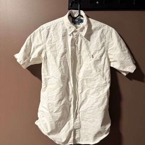 Ralph Lauren Slim Fit skjorte for herre i størrelse M. Skjorten har kort erm og klassisk krage med knappestolpe i front. Passer til hverdagsbruk og mer formelle anledninger, og kan kombineres med både bukse og shorts.