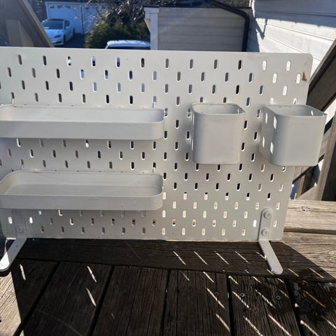 IKEA skådis oppslagstavle selges med 6 opphengsklyper, 1 hylle og 3 kroker.