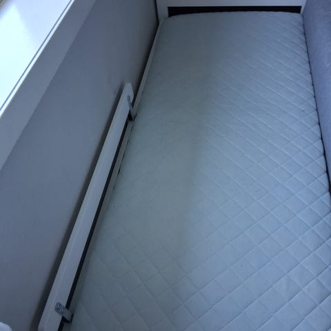 Enkel barneseng i hvit utførelse. Med ribb bunn og madrass. Nesten ikke brukt. Stått på gjesterom. Merke: Kritter.