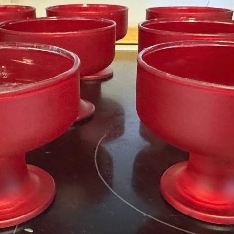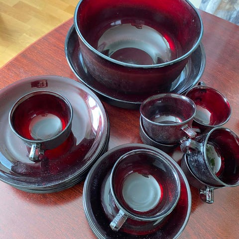 Retro servise i rød glass.