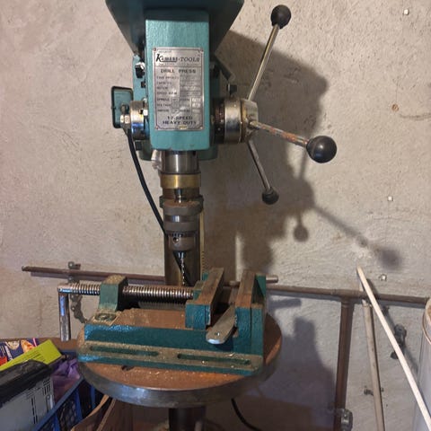 Søylebormaskin i grønn utførelse. Maskinen har fast søyle, bord med spor for feste av emner og håndspak for senking av borspindel. Egnet til boring i tre, metall eller plast, avhengig av montert bor og innstillinger. Passer til verksted, garasje eller hobbybruk der det er behov for presis boring i faste emner. Selges for kunde og må hentes i Oslo. Ikke testet enda