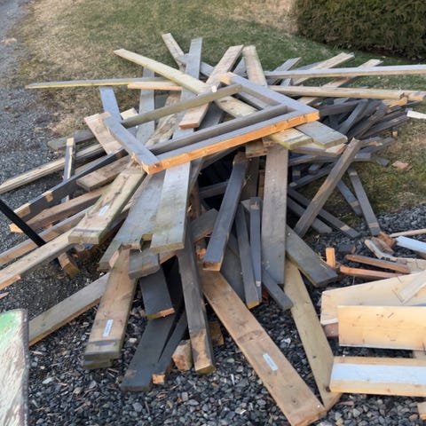 Demontert - tatt opp med brekkjern, så noen av skruene sitter fortsatt i.