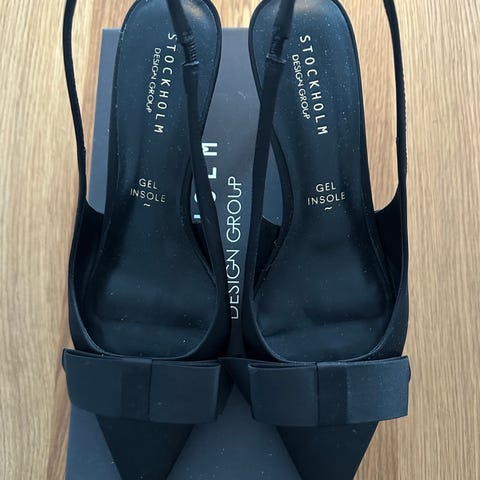Stockholm Design Group hæler i størrelse 40. Skoene er svarte med spiss tå og tynn hæl. De har ankelrem med gullfarget spenne og overdel i glatt, blankt materiale. Passer til bruk ved formelle anledninger, kontor eller andre situasjoner der pene hæler er ønsket. Som nye. Mob. 99410633