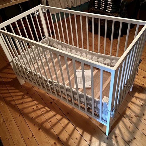 Barneseng (IKEA Sundvik) med sprinkelbeskyttelse (IKEA Lenast) og polymadrass (IKEA Skönast). Laken medfølger dersom det er av interesse. Kjøpt i 2020.