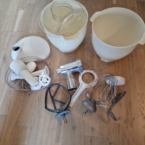 Godt brukt Kenwood major kjøkkenmaskin. Kjøkkenmaskinen er en eldre modell, men den fungerer som den skal. Plastbolle, ballongvisp, eltekrok og K-visp/rører medfølger. Eltekrok og K-visp/rører sverter litt av, men det er mulig man kan fikse dette med en stålbørste. Ellers trenger sikkert maskinen en liten rengjøring.