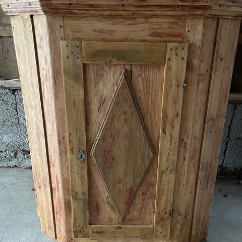 Gammelt og dekorativt hengeskap med ny lås. Bredde 50, dybde 24 og høyde 59. Meget solid laget. Ny lås er satt inn av snekker.