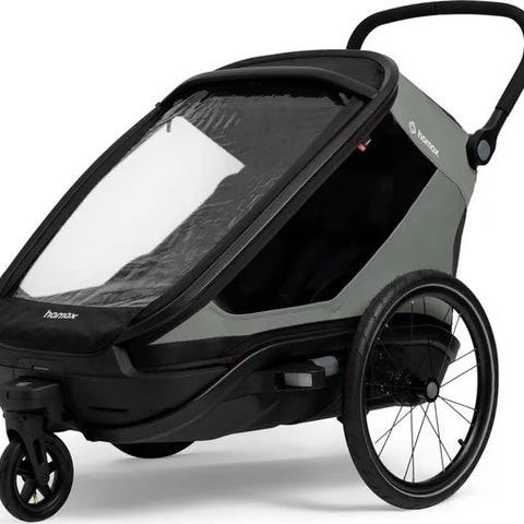 Følger med regntrekk, solskjerm og organizer/koppholder. Sykkelfestet og stagene til joggesett følger ikke med, men vi har hjul til joggesettet.
