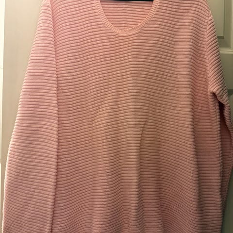 Selger en fin rosa genser med hvite striper. Genseren er myk og behagelig i stoffet, og passer perfekt til hverdags.