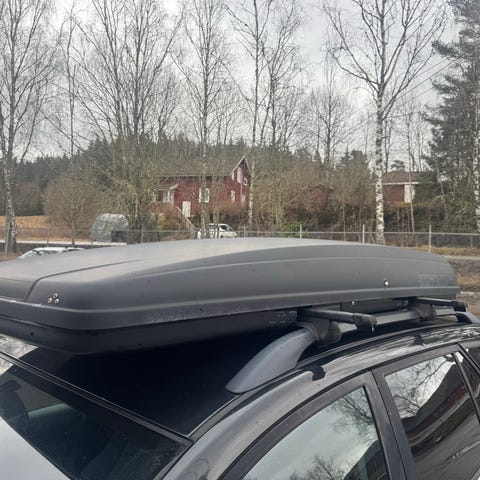 Takboks til bil i svart farge. Monteres på takstativ med medfølgende fester. Boksen har innvendige festestropper for sikring av bagasje. Egnet for ekstra oppbevaring av bagasje på taket av bilen ved transport og reiser.