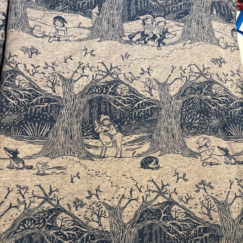 Bomull og lin restestoffer. Noe har vært brukt som liftgardin.