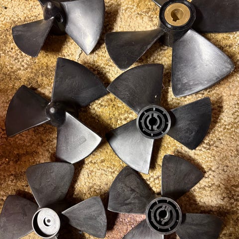 4-blads propell i grå farge. Propellene har sentral nav med festehull for montering. Egnet som reservedeler eller utskiftbare propeller der dimensjoner og feste passer. Materiale og eksakte mål er ikke oppgitt og bør kontrolleres mot eget utstyr før bruk.