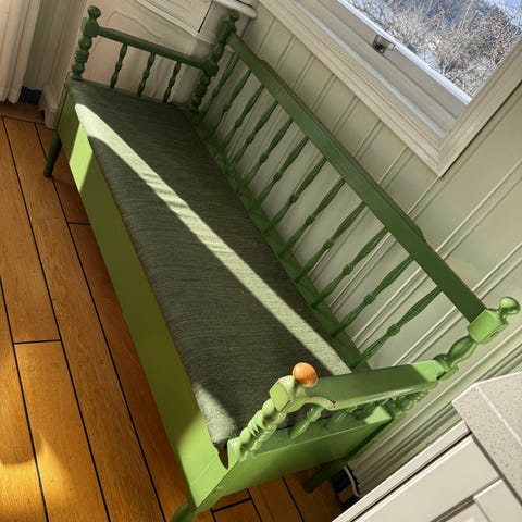 Liten benk med oppbevaringsmuligheter, bør males.