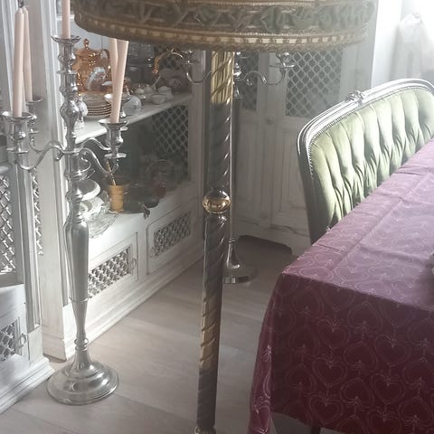 Elegant gulvlampe i klassisk stil med messingfot og lys tekstilskjerm. Lampen gir et varmt og behagelig lys, perfekt som stemningsbelysning i stue, soverom eller lesekrok.