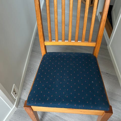 Selger 4 stk. av disse stolene. Stolene er i eik og trukket med grønt møbelstoff. Stoffet er helt og i orden, ingen flekker, solbleking eller skader på trekkene. Stolene er i bra stand