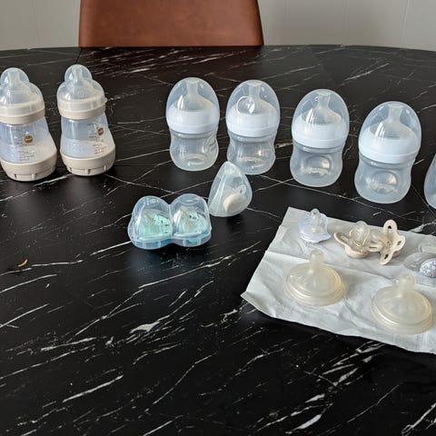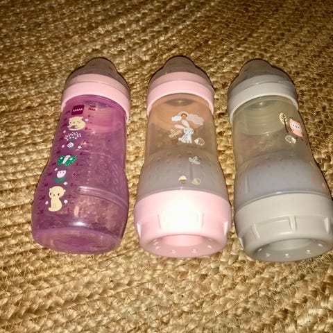 Fint og lite brukt tåteflasker og forskjellige størrelser på smokk. Mange av smokkene til flaskene er lite brukt og ikkje brukt, og alt er vasket og kokt etter hver bruk.