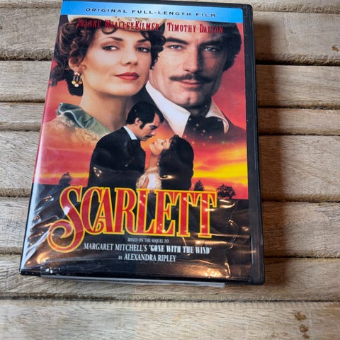 Scarlett DVD spillefilm. Filmatisering av oppfølgeren til historien om Scarlett O’Hara fra «Borte med vinden». Utgivelse på DVD med omslagstekst på norsk. Sjanger: romantisk drama, historisk kostymedrama. Egnet for samlere eller for de som ønsker å se fortsettelsen på fortellingen om Scarlett og Rhett på fysisk format.