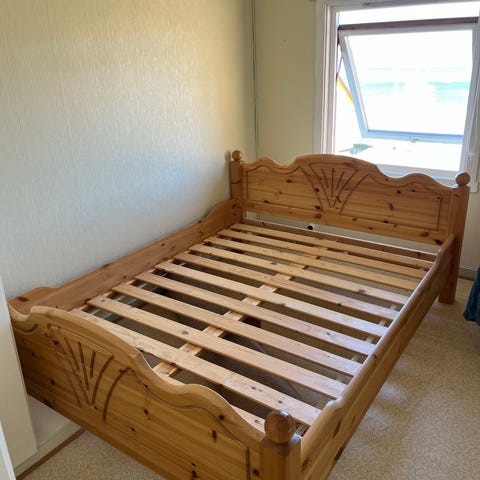 Gir bort en godt brukt dobbeltseng. Det er plass til 2 x madrasser på 75 cm.