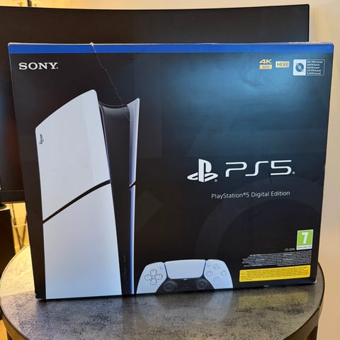 Playstation 5 Slim Digital Edition, 1TB lagring + en kontroller selges grunnet lite brukt. HDMI kabel, strømkabel til enheten og en ladeledning til kontrolleren følger med.