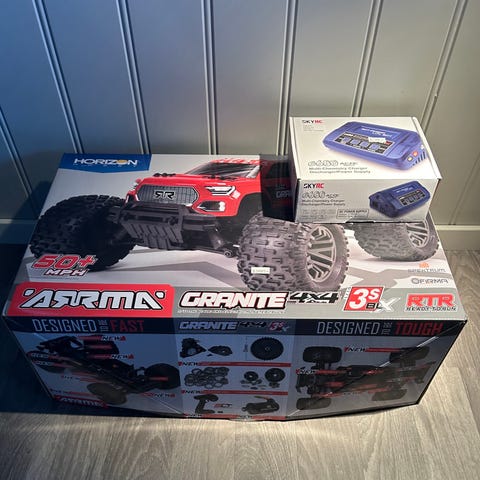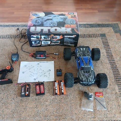 Selger en Traxxas Rustler VXL fjernstyrt bil. Modellen er en elektrisk terrengbil med børsteløs Velineon‑motor og uavhengig hjuloppheng. Bilen har rødt karosseri og leveres med 3 hjulsett, fjernkontroll, 3 batterier og koffert med diverse reservedeler slik det vises på bildene. Det ene batteriet er et lithium batteri som gjør at biler går i 120kmh. Videre så er det også installert metalldeler for akslinger, og kollisjonsplate. Det følger med original eske fra Traxxas Rustler VXL‑serien samt originale papirer/ bruksanvisninger etc.