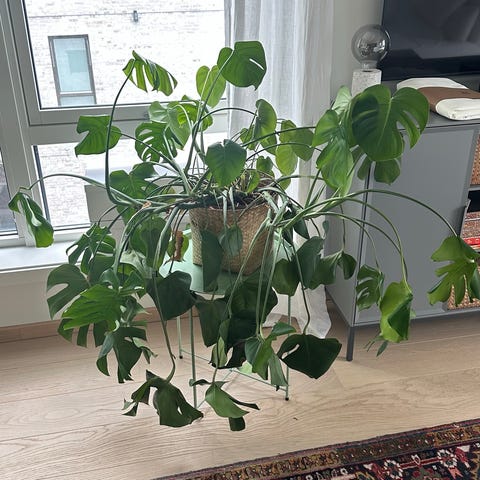 Monstera deliciosa potteplante i grønn farge. Planten har store, flikete blader og står i en enkel potte. Egner seg som inneplante i stue, kontor eller andre oppholdsrom med indirekte lys. Kan plasseres på gulv eller bord, avhengig av ønsket uttrykk og tilgjengelig plass.