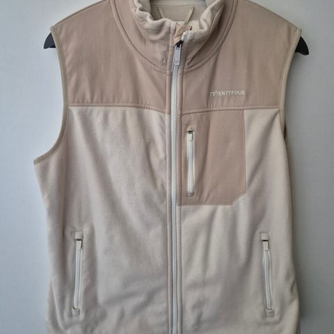 EWM (britisk merke) vest for dame/herre i størrelse M/L. Vest i beige med kontrastdetaljer i lysere tone. Yttermateriale i 100 % polyester, innside i 64 % polyester og 36 % akryl. Modellen har høy hals, glidelåslukking foran og lommer i sidene. Egnet som et ekstra lag over gensere eller topper i kjøligere vær.