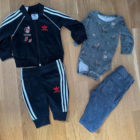 Adidas joggedress for gutt i størrelse 62. Sett med jakke og bukse i flerfarget design med hovedfarger svart, blå og neongul. Jakken har lang arm. Buksen har strikk i livet og korte ben. Egnet som hverdags- og fritidstøy for baby.