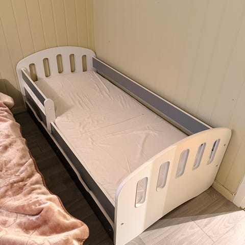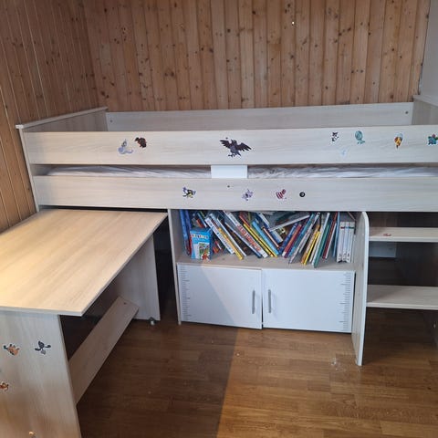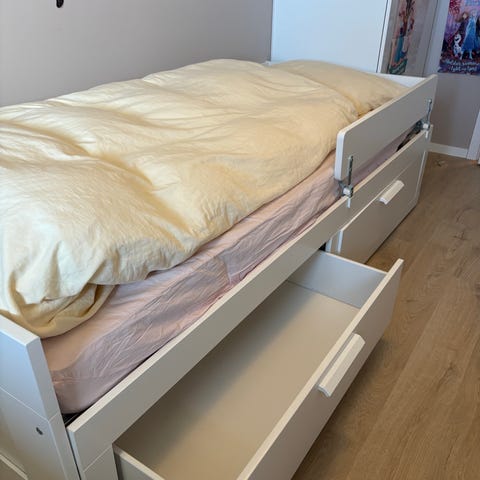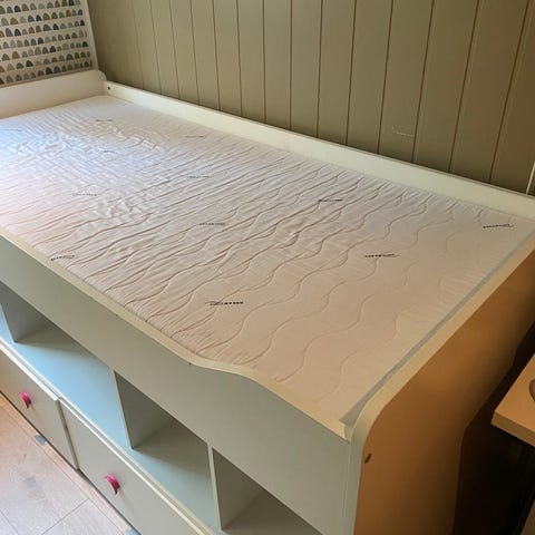 Seng selges,noe bruksmerker men ganske hel og grei.Den ene bunnen henger litt som vist på bilde.Madrassen følger ikke med,sengehesten er litt slitt men følger med.