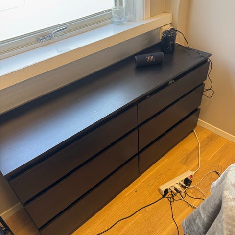 Fin brun kommode fra Ikea, godt brukt, men enda fin. Den har stått inntil en trapp derfor malt på baksiden (en liten del er ikke malt på baksiden).