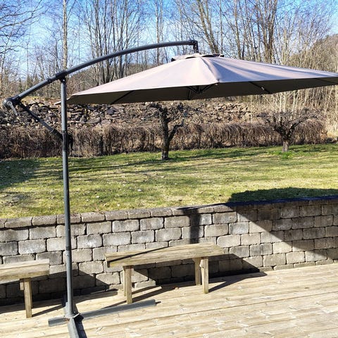 Veldig god stand parasoll med roterende sidetilt 360 grader 300x300cm. Aluminium stang og polyester duk.